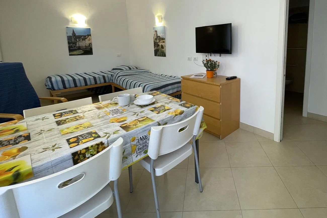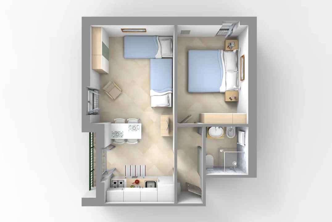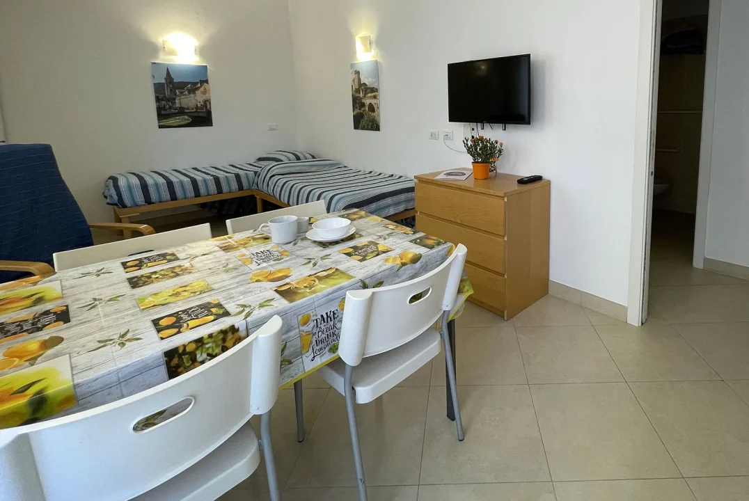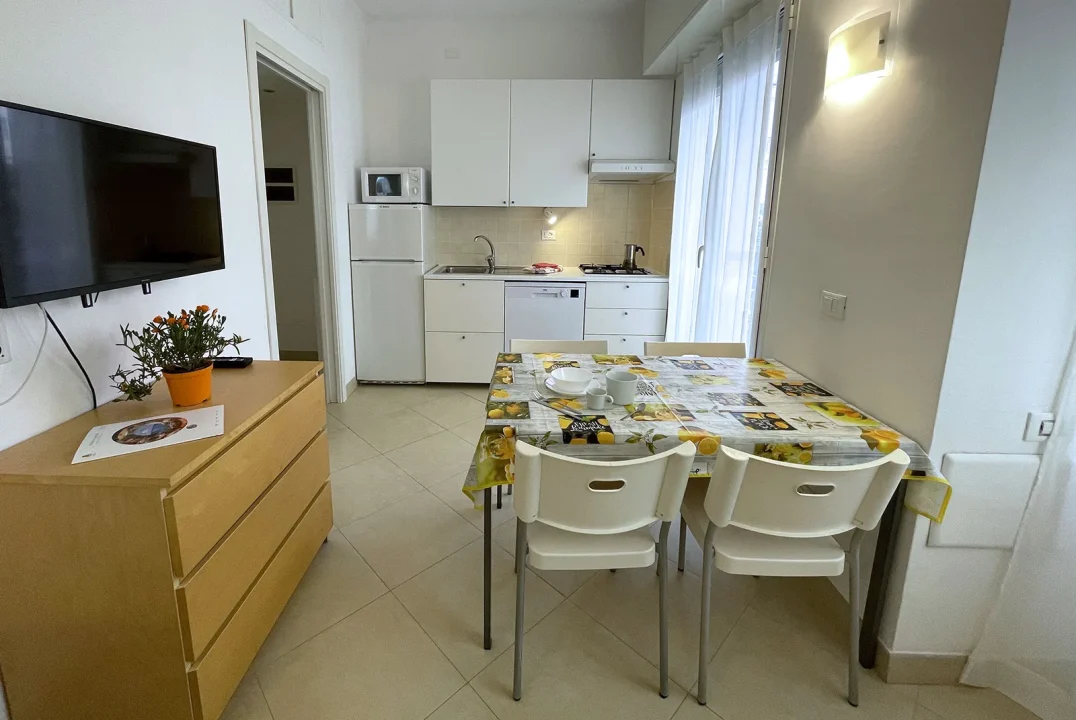 I Bilocali Tipo C del Residence Glicini offrono 35 m² ben distribuiti: camera da letto indipendente, soggiorno con letto doppio (o due singoli), cucina completa e bagno privato.