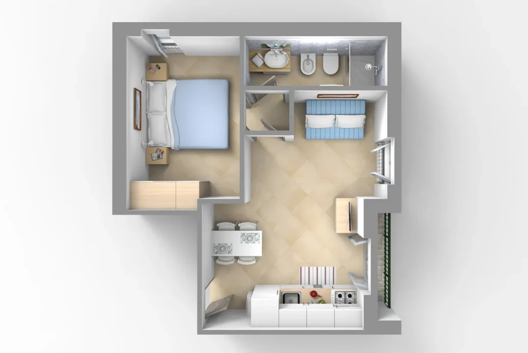 Il Bilocale Tipo D del Residence Glicini è la scelta perfetta per chi desidera la comodità degli interni e il piacere di uno spazio esterno privato.