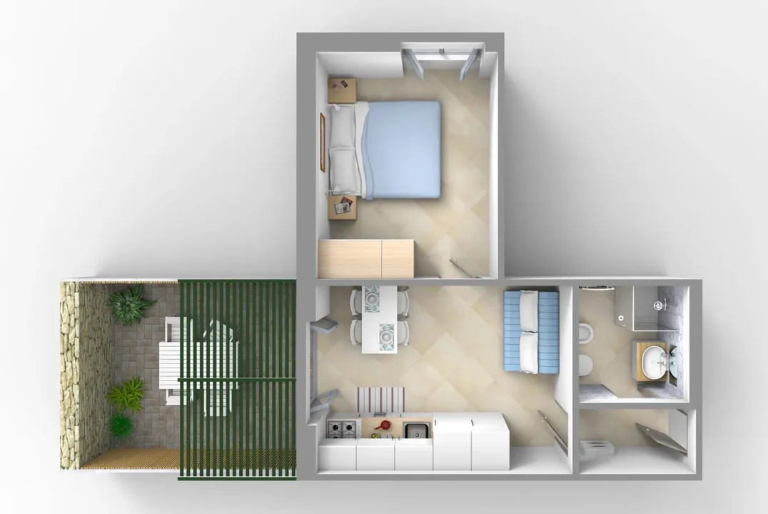 Il Bilocale Tipo H del Residence Glicini unisce la comodità degli interni alla libertà di uno spazio esterno privato dove fare colazione o rilassarsi al rientro dal mare.