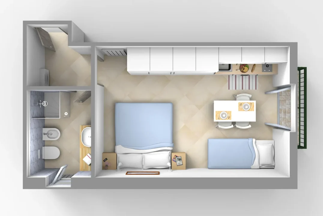 Monolocale B – Armadi a parete e angolo cottura attrezzato